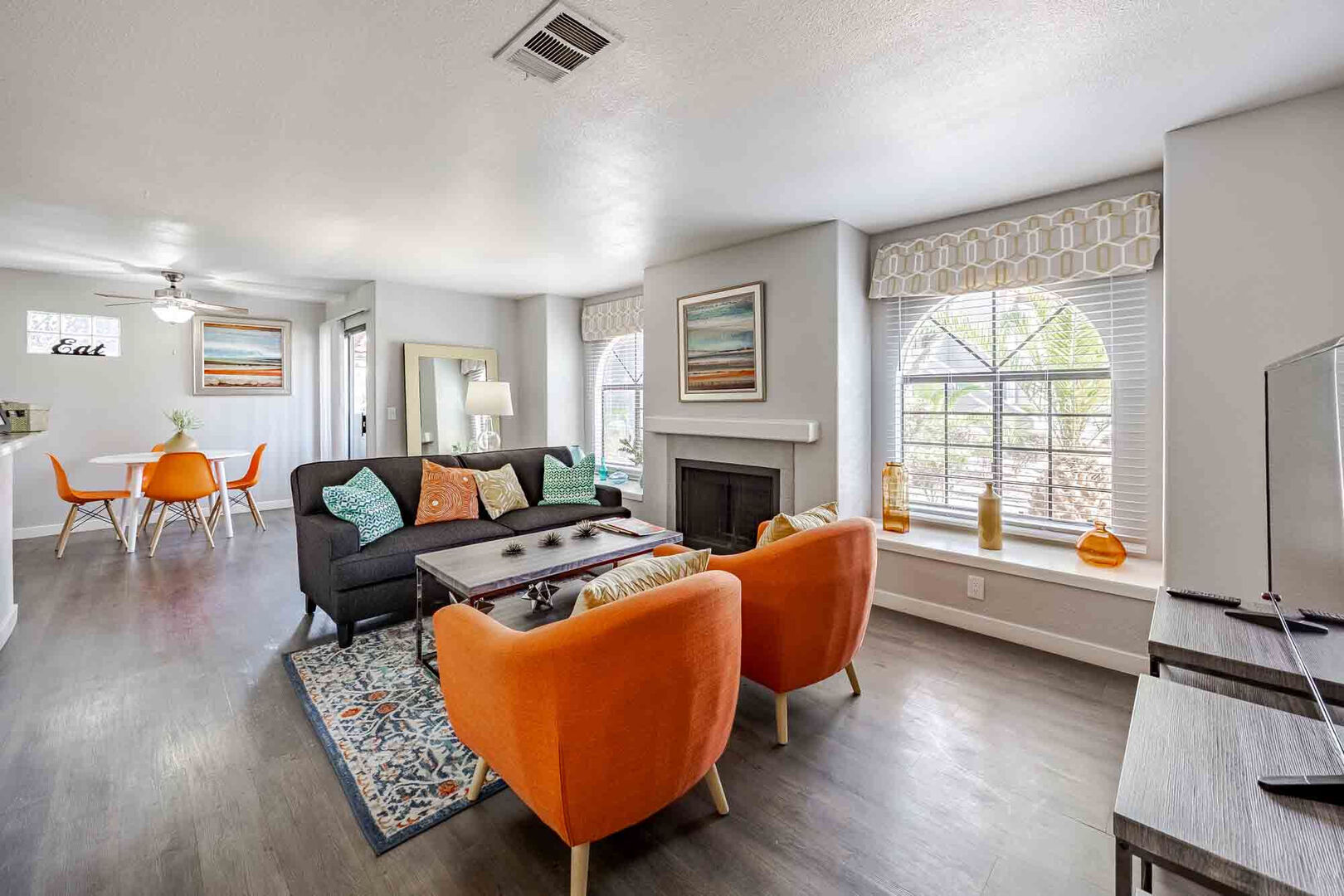 like stainless-steel appliances and bay windows provide plenty of aesthetic